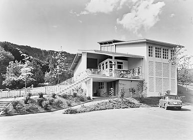 1953. Einfamlienhaus Freda Zollinger-Streiff, Küsnacht. Otto Zollinger baute es während seiner dritten Ehe für seine zweite Ehefrau, meine Grossmutter. Sie hatte auch viele Dekorationsmalereien für ihn gemacht in Gebäuden während der Saarbrückner-Zeit und auch in Mövenpicks. In einer gewissen Weise erinnert das Haus an die Villa Streiff, ebenfalls in Küsnacht, und zwar durch die überragende Oeffnung auf die Seeseite und dem relingartigen grossen Balkon, platziert in einer Wiese, aber infolge des Holzes vielleicht mehr an ein Segelschiff als einen Ozeandampfer. Infolge Erbfolge war es nicht möglich, das Haus in der Familie zu behalten und ist heute durch einen Neubau ersetzt. Einzelne Bauteile sind heute in meinem Haus in Illnau-Mesikon integriert.